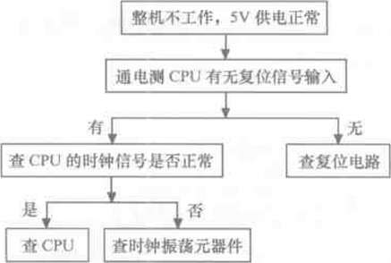 整機(jī)不工作是指插好電源線后壓縮機(jī)不運(yùn)轉(zhuǎn),顯示板上的指示燈或顯示屏也不亮,該故 障主要是由于市電供電系統(tǒng)或主控制板異常所致。該故障根據(jù)有無(wú)5V電壓又有所不同,沒(méi) 有5V電壓說(shuō)明市電輸入系統(tǒng)、主控制板上的低壓電源電路異常:若5V供電正常,說(shuō)明CPU 電路異常。整機(jī)不工作.無(wú)5V電壓的故障檢修流程如圖8-9所示:整機(jī)不工作,有5V電壓 的故障檢修流程如圖8-10所示。