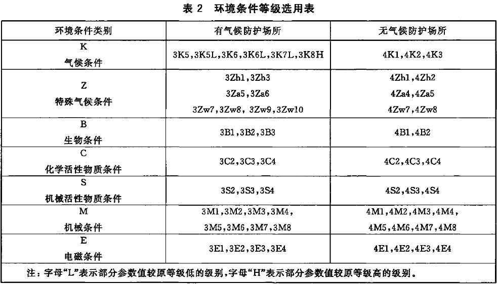 環(huán)境條件的種類包括z 氣候條件(K) 、特殊氣候條件(其中Zh 代表熱輻射條件;Za 代表周圍空氣運(yùn)動(dòng)條件;Zw 代表除雨以外的水源、條件)、生物條件(B) 、化學(xué)活性物質(zhì)條件(C) 、機(jī)械活性物質(zhì)條件(S) 、機(jī)械環(huán)境條件(M)和電(E)磁環(huán)境條件 共七類。